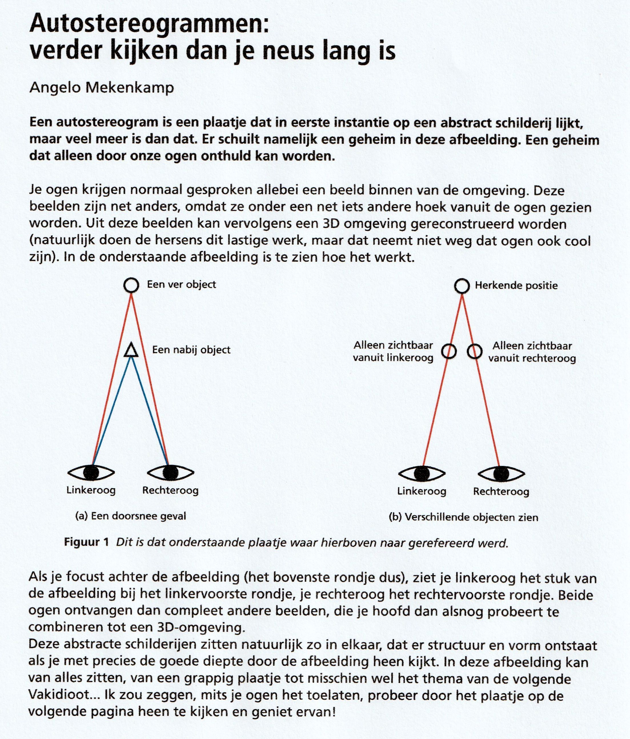 De truc heeft betrekking op het scheiden van focus en convergentie bij het kijken naar een afbeelding (autostereogram) die met een vrij eenvoudig algoritme tot stand is gekomen. Dergelijke afbeeldingen hebben geen natuurlijke tegenhanger en konden pas gemaakt worden nadat computergraphics een voldoende ontwikkelingsniveau hedden bereikt. Ons visuele systeem is zodoende in staat beelden te zien die onder natuurlijke omstandigheden voor de buitenstaander verborgen zouden blijven.