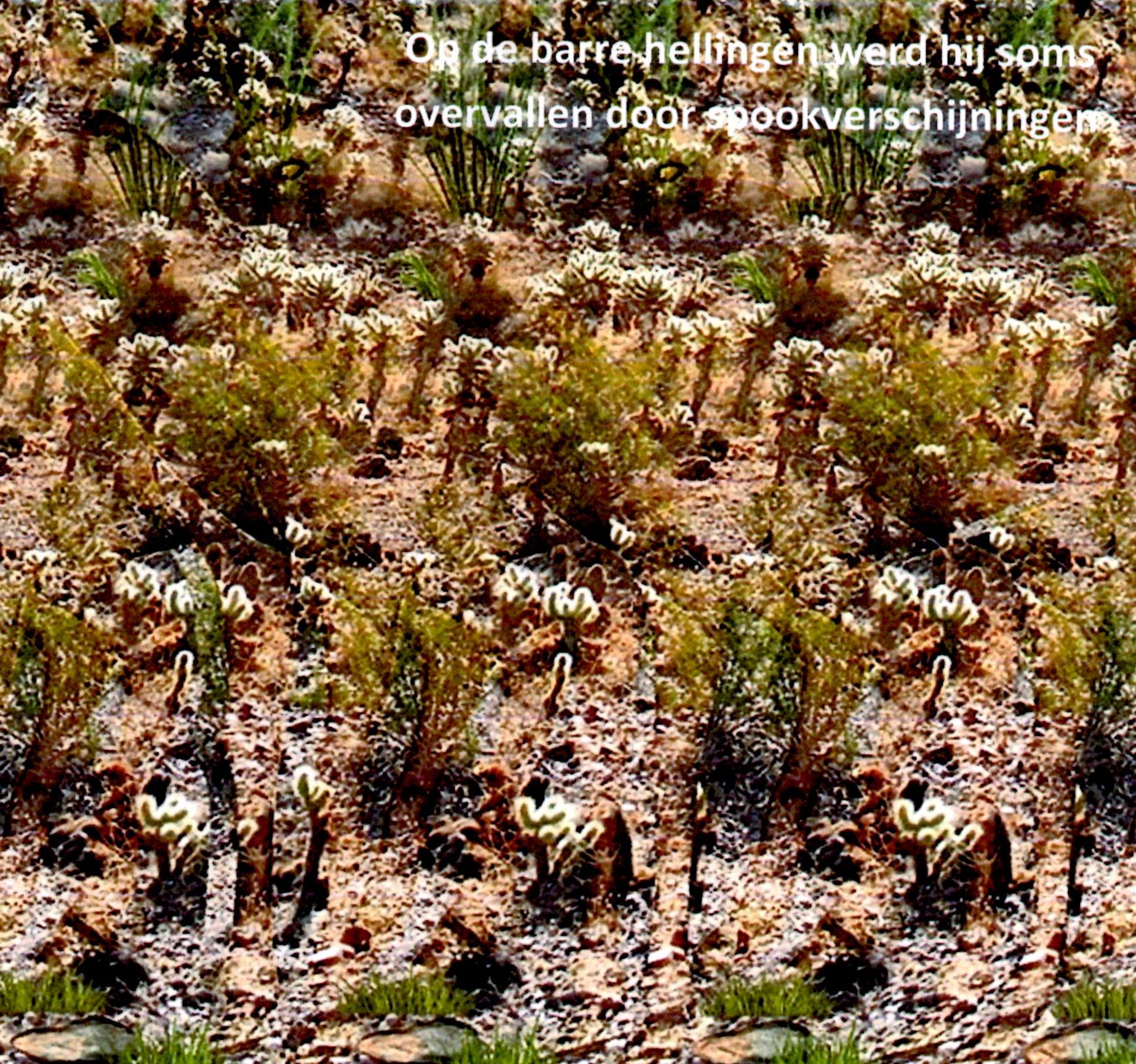 De indianen waren ondertussen al verder afgedaald zodat er dit keer geen zorgzame arm was om hem op te vangen. Hij smakte met zijn hoofd tegen een steen en bleef beduusd liggen. Toen hij zijn ogen opsloeg zag hij dat het terrein er aan deze kant van de berg eigenlijk net zo uitzag als de helling die ze hadden beklommen. Overal waar hij keek, laag struikgewas en cactussen, en lucht die trilde in de zon. En de indianen waren nergens te bekennen.