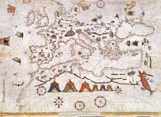 De eeuwenlange handelsbetrekkingen rondom de Middellandse Zee hebben beslist bijgedragen aan het uitwisselen van kennis en ideeën. Feniciërs en Corinthiërs maakten al vóór onze jaartelling gebruik van ingewikkelde instrumenten om hun positie op zee te bepalen aan de hand van hemellichamen.* Hun schepen werden voortgedreven met behulp van roeikracht en vierkante razeilen. Later werden ze verdrongen door de numerieke overmacht en agressie van de Romeinse galeien. Navigatiemiddelen als het astrolabium en het kompas werden vanuit de Arabische wereld verspreid en waren aan het begin van het tweede millennium de voornaamste instrumenten voor een redelijke plaatsbepaling. Zowel de Moren als de Italiaanse maritieme republieken maakten er gebruik van.* Dwarse tuigages werden vervangen door langsgetuigde latijnzeilen* om scherper voor de wind te kunnen varen. Uiteindelijk waren Christelijke kruisvaarders in het voordeel omdat die ook nog gebruik maakten van nocturlabia waarmee ze ’s nachts konden navigeren.*