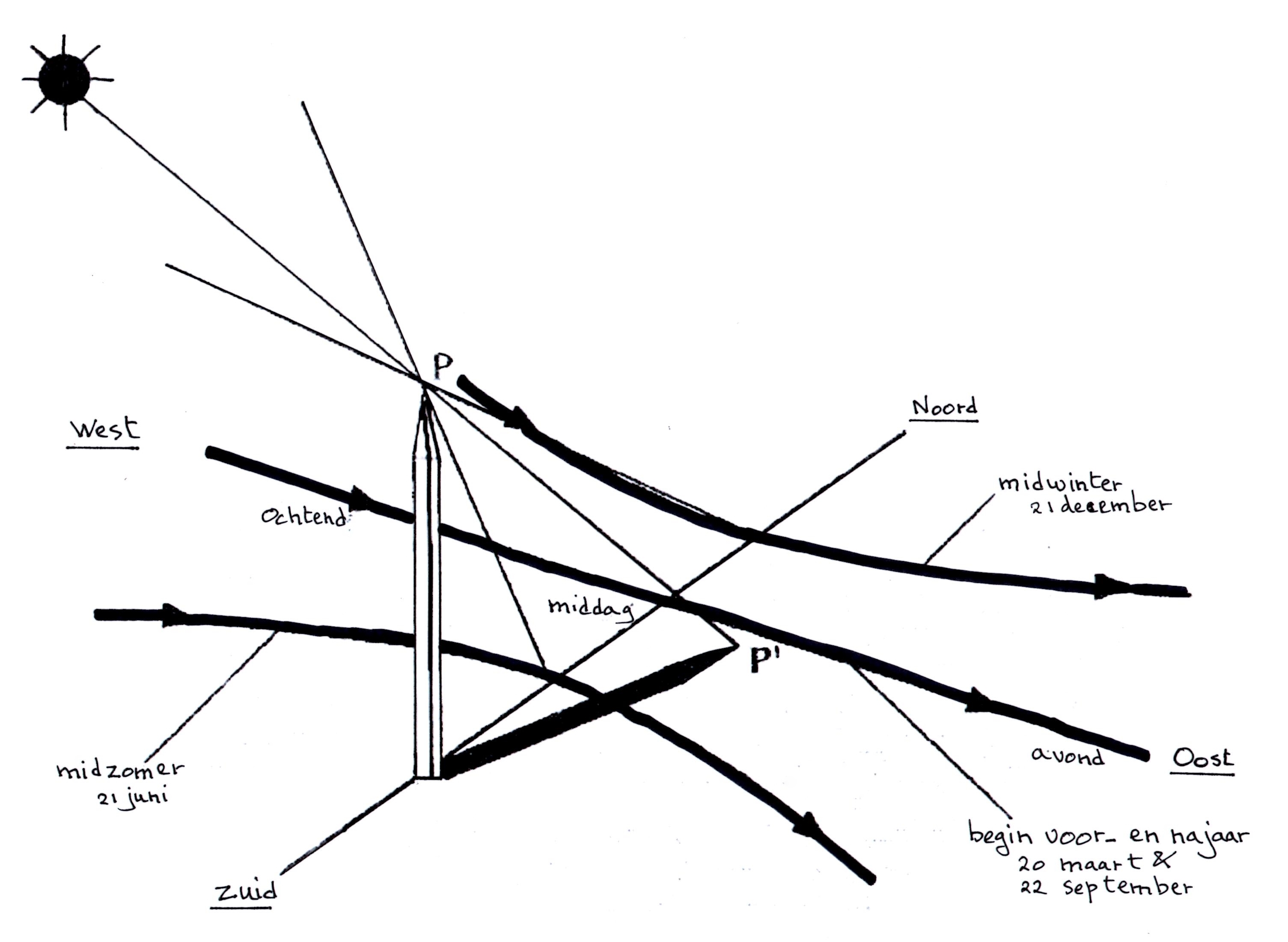 De Griekse natuurfilosoof Eratosthenes (3e eeuw voor onze jaartelling) constateerde die verandering toen hij door het Nijldal trok. Stroomopwaarts in het zuiden, nabij Syene (het huidige Aswan), zag hij dat soms de bodem van een diepe waterput geheel door de zon werd beschenen, iets wat hij in Alexandrië nooit gezien had. Dat bracht hem op een geniaal idee. De natuurfilosofen van zijn tijd waren van mening dat de aarde een bolvorm had. Dat maakten ze op uit waarnemingen van schepen aan de horizon en de altijd ronde aardschaduw tijdens maansverduisteringen. Ze hadden echter geen idee hoe groot die bol was. Uitgaande van een cirkelvormige omtrek van de aarde bedacht Eratosthenes dat te kunnen berekenen met behulp van wat meetkunde. Alles wat hij nodig had was de schaduwlengte van een rechtopstaande stok (met bekende lengte) op de kortste dag in Alexandrië en de afstand tussen Alexandrië en Syene (die bekend was maar naar onze huidige opvatting niet erg accuraat). Het resultaat week ca. 10% af van moderne metingen. Zie bijvoorbeeld http://www.betavak.nl/aarde.htm
